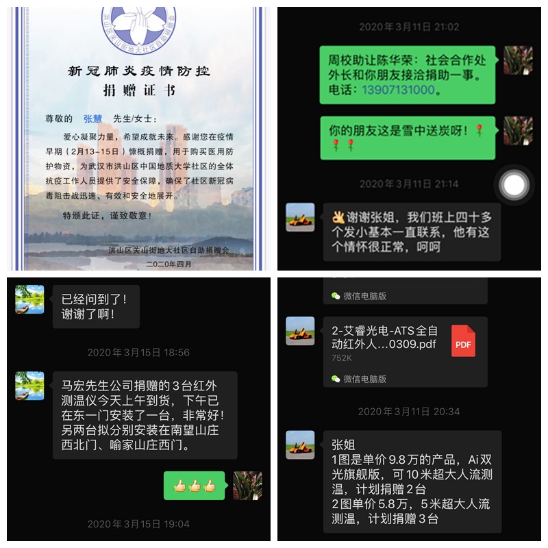 实验中心张慧同志是beat365官网喻家山庄业主委员会主任。疫情爆发后,她迅速联系业委会委员,配合居委会发布通告,及时了解学校及小区居民的发病人员情况。在物业管理人员缺乏,小区消杀物资有限的情况下,组织成立业主自救小组,将业主中的医务人员充实到组织中来。借助学校物业管理的能力对小区的公共区域进行大规模的消杀.多方联系团购渠道,为小区居民提供了便利。进一步完善各楼栋单元的QQ群,摸清现在居住在小区的住户名单及家居人口数。在缺乏防护物质的前提下,不等不靠,组织业主捐款购买护防装备提供给医护人员,保卫人员,社区工作人员,物业管理人员及小区志愿服务人员。在张慧同志的带领和组织下,广大业主积极响应,共筹得善款十七万余元。同时,张慧同志联系到烟台睿创维纳技术股份有限公司的朋友,给beat365官网捐赠了三台ITS智能红外体温检测设备,分别投入到学校东一门、南望山庄西北门和喻家山庄西门使用,大大提高了体温的检测效率和准确性。